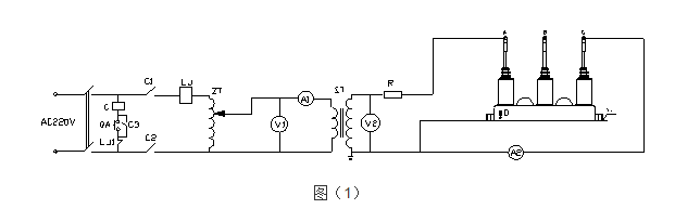 ? ? ? ?V1、V2-電壓表 ?A1、A2-數(shù)字電流表 ?ZT-調(diào)壓器 ?ST-試驗(yàn)變壓器 ?LJ-電流繼電器 ?R-限流電阻